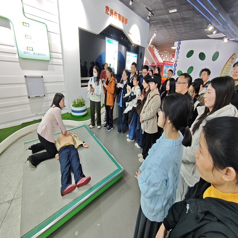 在意外伤害急救体验区,心肺复苏实操成为全场聚焦的核心体验项目。“按压深度5-6厘米、频率每分钟100-120次,按压后需确保胸廓完全回弹,人工呼吸时要注意密封气道!”讲解员通过模型演示,详细拆解心肺复苏术的操作要领,从判断意识、呼救报警到胸外按压、开放气道、人工呼吸的全流程,逐一强调动作规范与时间节点。在公共危机管理中,应急救援的时效性直接决定处置成效,而心肺复苏这类基础急救技能,正是在突发状况下专业救援抵达前的重要保障。当意外发生时,一次标准的心肺复苏可能挽救一个家庭,这正是“以人民为中心”思想最鲜活的实践表达。